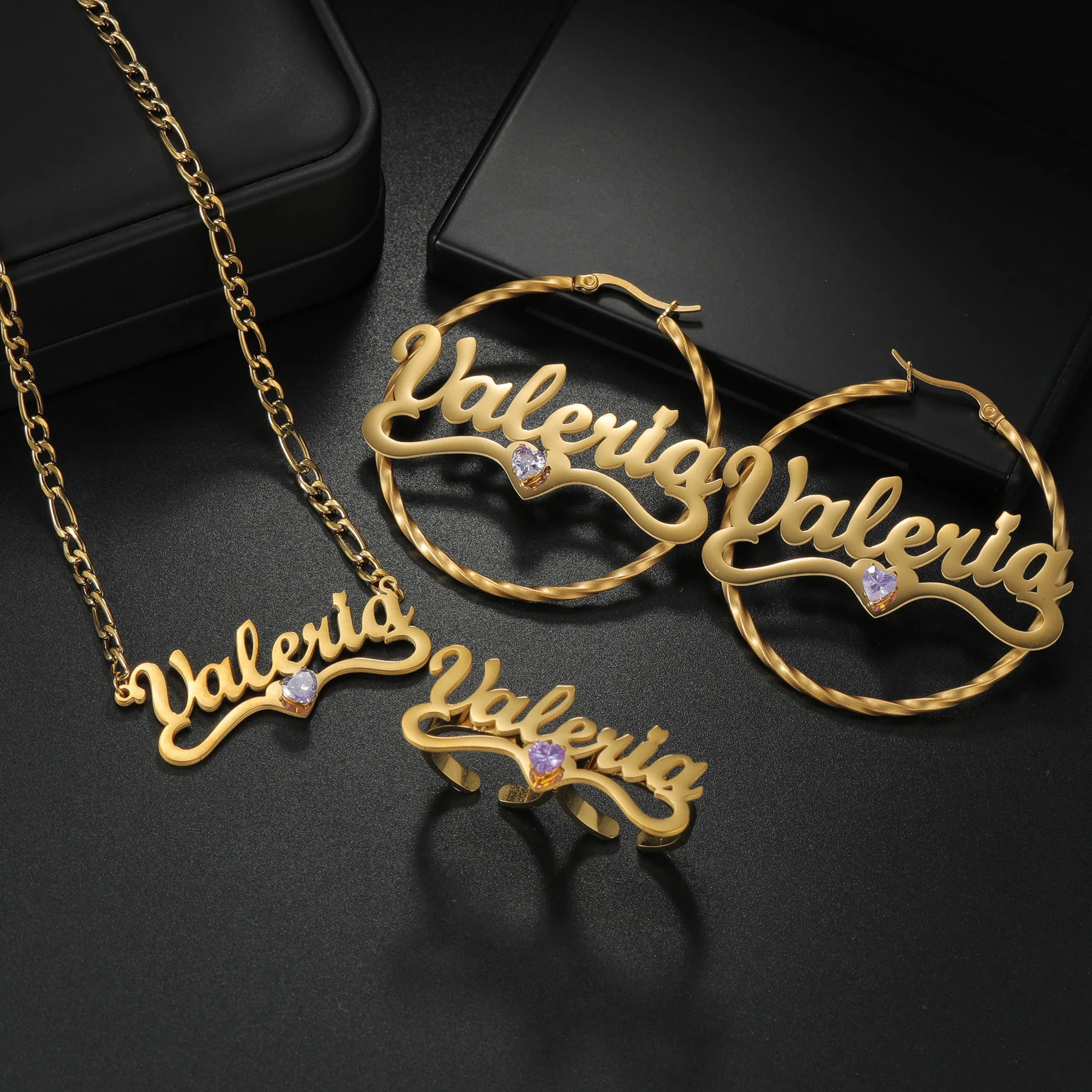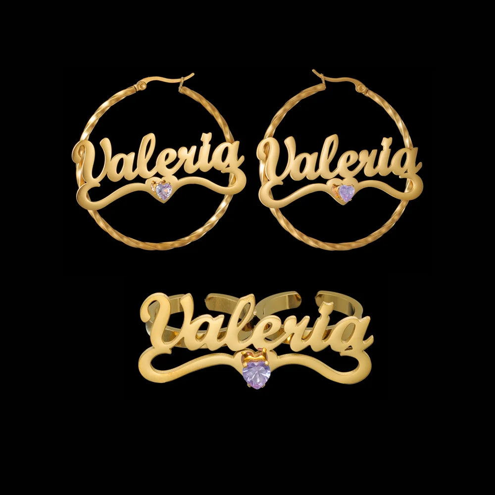 Get your birthstone color on this beautiful set with a pair of 50mm earrings…necklace & adjustable 2 finger ring